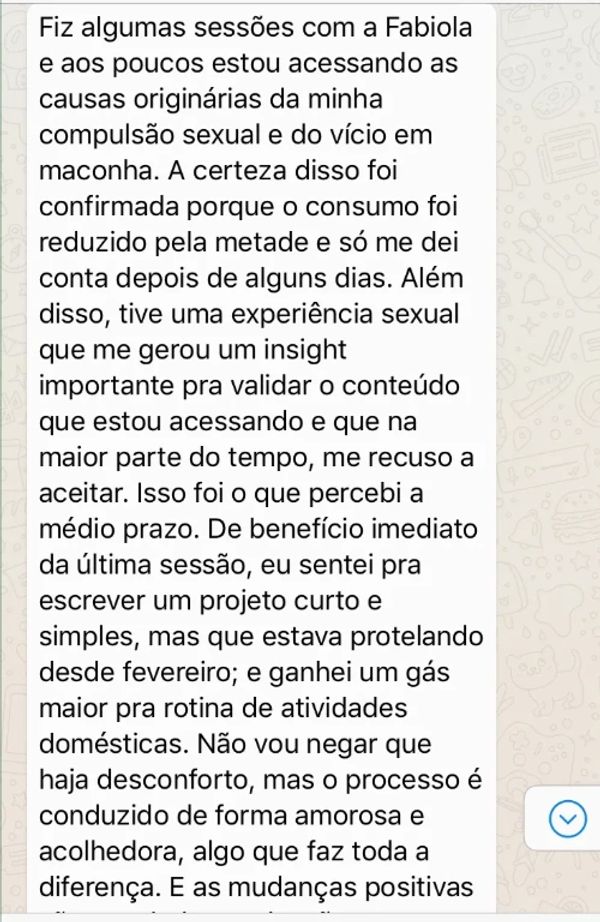 Eu te ajudo a entender os porquês por trás desse problema e te ofereço ferramentas poderosas que te conduzem na direção da sua busca por liberdade dos bloqueios e amarras emocionais que te impedem de evoluir e avançar na vida, em todas as áreas: social, relacionamento amoroso, familiar, profissional.